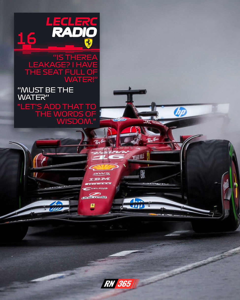 Zo belandde Leclerc op een gegeven moment in een wel heel aparte situatie. De regen kwam al even met bakken uit de hemel, maar de Monegask schrok toch een beetje toen hij merkte dat er een aardige plas water in zijn cockpit stond. Hij meldde dat dan ook direct over de boordradio: "Heb ik een lek, of zo? Heel mijn stoeltje staat vol met water!"