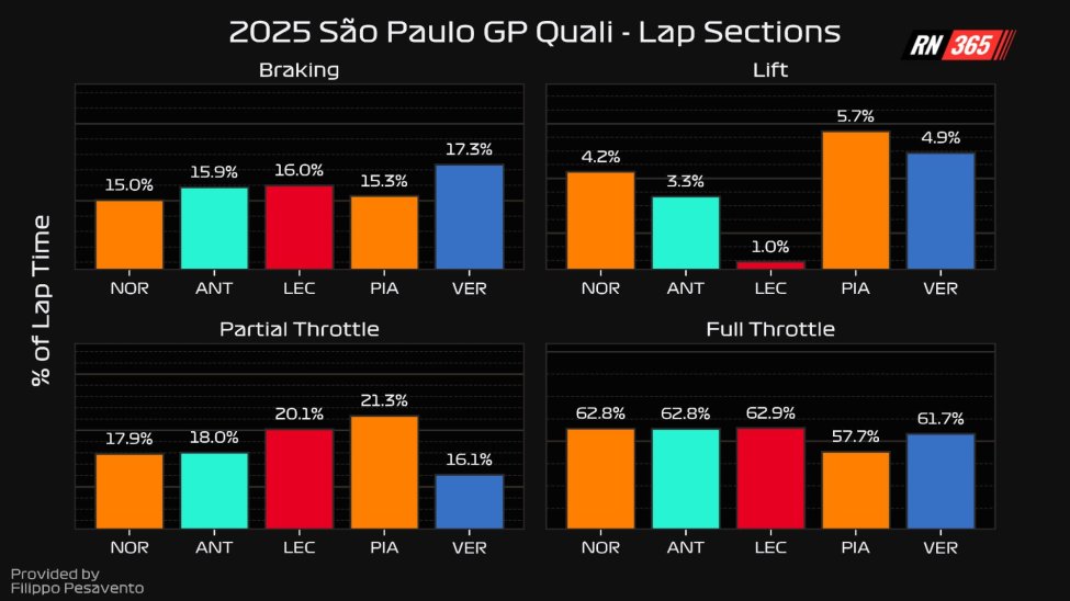 Dat Verstappen ook meer moet liften dan de meeste van zijn concurrenten, bovenop het feit dat hij al veel tijd kwijt is aan remmen, toont eens te meer aan dat hij niet over de auto beschikte om de bochten aan te vallen. Zo verliest hij zowel tijd op de entry als de exit van de bocht.