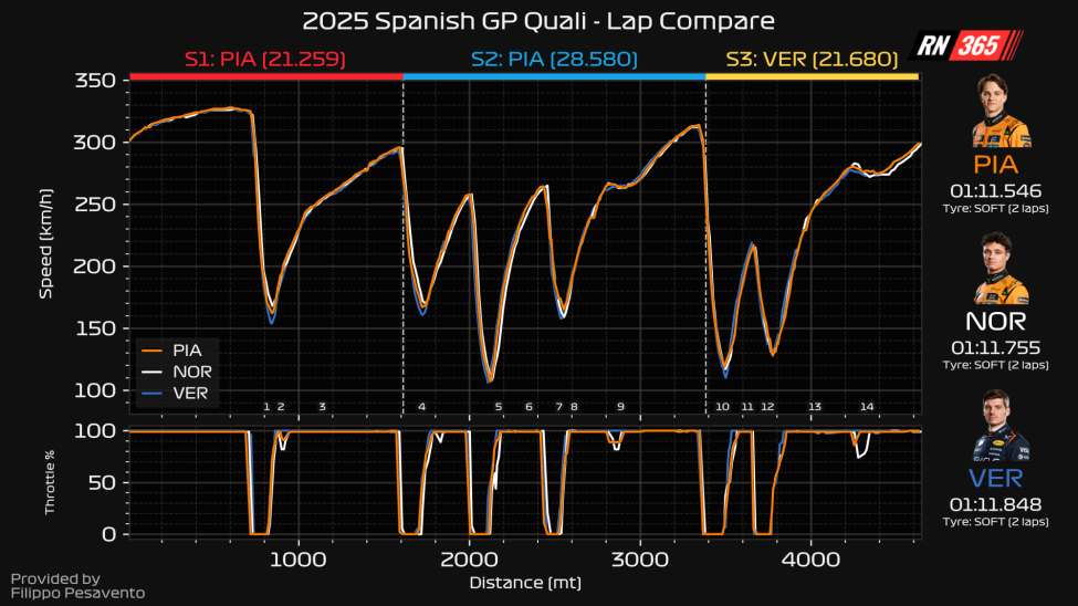 Kijk in onderstaande grafiek eens naar de 'dalen' van de lijn. Die dalen staan voor de remzones en bochten. Steeds opnieuw zie je dat Verstappen (de blauwe lijn) ruim onder die van de McLarens uitkomt. Met andere woorden, hij kan aanzienlijk minder snelheid mee de bocht in nemen. Dat dat aan de auto ligt en niet zozeer aan het lef van Verstappen, laat het statistiekje daaronder zien, onder 'throttle %'. Kijk naar bocht 9. Waar Norris en Piastri allebei liften, houdt Verstappen de klepel vol naar beneden.