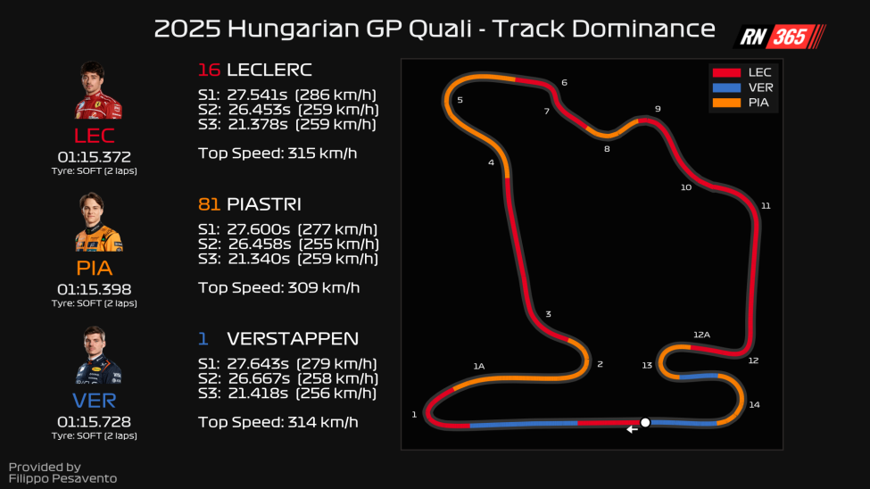 In Hongarije loont een extreme setup, gericht op de krachten van de RB21, echter niet. De bochten volgen elkaar razendsnel op en zijn redelijk lang. In bocht 1, 2, 5, 13 en 14 moet je geduld hebben voordat je op het gas kunt en is mechanische grip cruciaal. En laat dat nu juist de achilleshiel van de RB21 zijn. Wat Verstappen en zijn engineers ook hebben geprobeerd, niets werkt om meer grip te krijgen. Verstappen benoemde zelf dat hij 'op ijs rijdt'. De coureur mist grip bij het insturen, krijgt onbalans in het midden van de bocht en kan daardoor de exit óók niet optimaliseren.