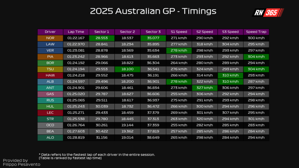 Tot slot moet Kimi Antonelli nog even worden benoemd. De jongeling stormde vanaf P16 knap naar de vierde plaats en is in de data de zesde coureur van het veld. Het is een ontzettend knappe prestatie van Antonelli, als je je ook bedenkt dat hij lange tijd vast zat achter langzamere auto's. Zodra Antonelli over vrije lucht beschikte, kon hij het tempo van de top van het veld aardig volgen. Het laat de potentie van het 18-jarige toptalent zien.