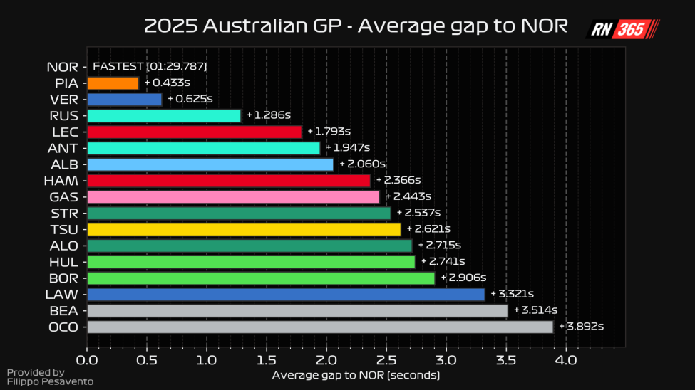 De stelling over bandenslijtage wordt ook bevestigd als er naar het verval in rondetijden wordt gekeken. Verstappen kon Norris namelijk redelijk matchen qua snelste tijden, maar valt veel verder terug. Waar Norris al zijn tijden gemiddeld binnen één tot anderhalve seconde houdt, valt Verstappen vanuit ronden in de 1:29 terug naar ronden in de 1:31. Ook Piastri is vele malen stabieler dan Verstappen, ware het niet dat ook hij Norris niet kan bijbenen. Zijn spin en terugval heeft daar natuurlijk ook mee te maken.