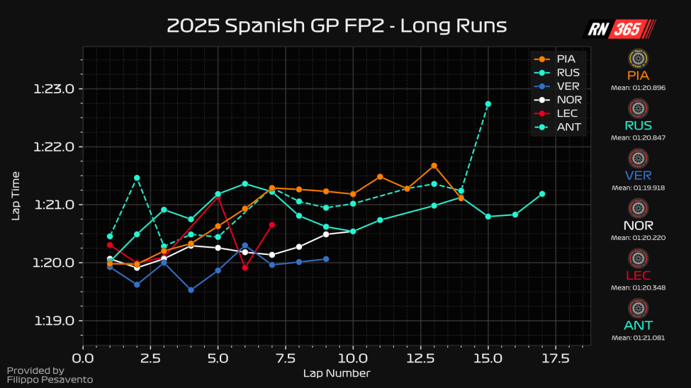 De lange runs tonen echter een ander beeld. Verstappen noteerde op de zachte band een indrukwekkend gemiddelde van 1:19.918 - hij bleef als enige onder de 1:20. Piastri, die zijn runs op de medium compound uitvoerde, was bijna een seconde langzamer. Lando Norris (zacht) kwam nog het dichtst bij Verstappen in de buurt, maar gaf alsnog drie tienden toe. Charles Leclerc volgde in de Ferrari op één tiende van Norris.