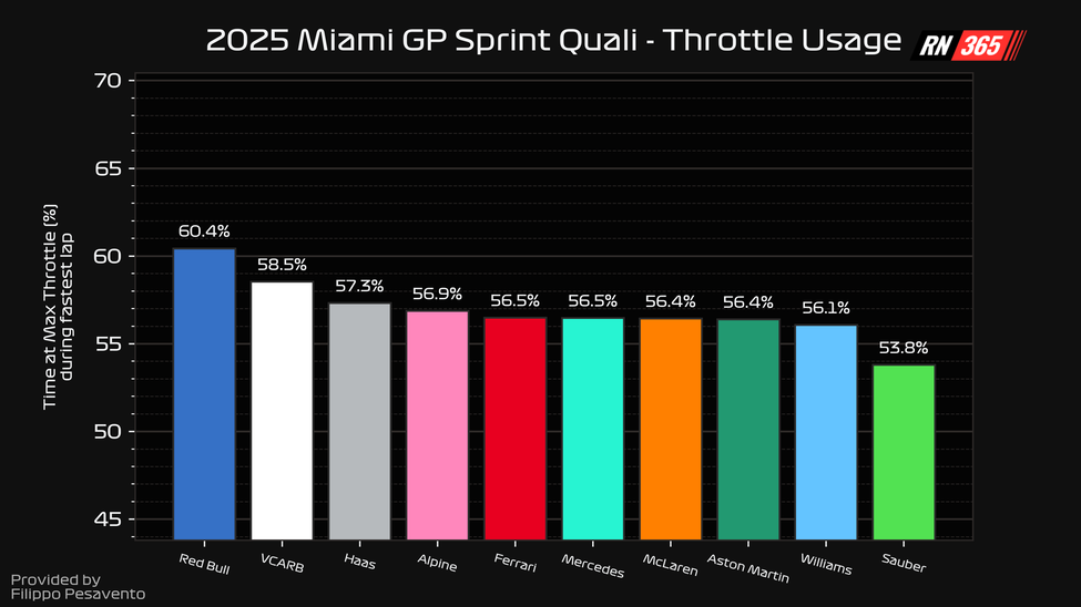 De RB21 laat zich gewillig van richting veranderen. In onderstaande visual zie je dat hij eigenlijk over de hele ronde genomen maar in een handjevol minisectoren de snelste was. Hij pakt zijn winst in de bochten 5 t/m 8, pas bij het uitaccelereren van bocht 8 nemen Oscar Piastri en Kimi Antonelli het commando weer over gedurende de rest van de ronde.