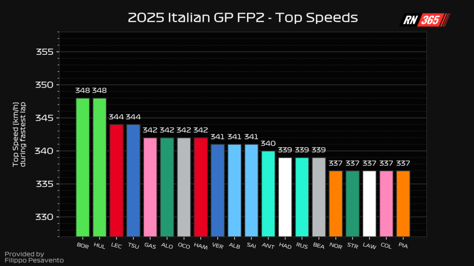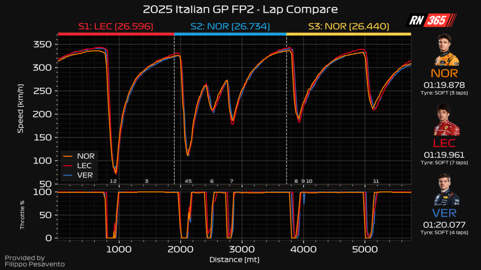 Die kleine achterstand is op zichzelf al positief, wetende dat Verstappen zijn eerste rondje moest afbreken door een foutje in Lesmo 2. Op alle vlakken mengde Verstappen zich bovendien in de strijd met McLaren en Ferrari, dat altijd flink uitpakt voor haar thuisrace in Italië. De 27-jarige Verstappen stond immers bovenin qua topsnelheden – Red Bull had ook de nieuwe motor direct opengeschroefd om tests uit te voeren – en won tijd in een aantal snelle bochten. De wereldkampioen kwam ten opzichte van Norris en Charles Leclerc bijvoorbeeld als winnaar uit de bus in bocht zeven en elf.
