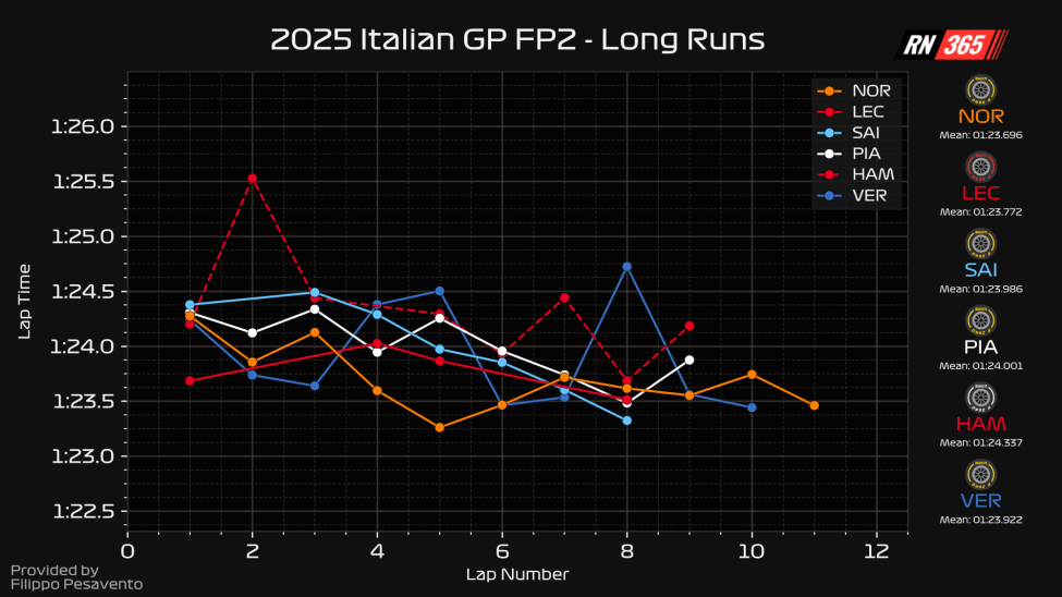 De longruns zagen er echter ook goed uit bij Verstappen. Gemiddeld was hij op mediums namelijk de nummer twee op de baan qua rondetijden, zo’n twee tienden achter Norris. Op zich zien we dat beeld al het hele jaar, maar de verschillen waren nu wel een stuk kleiner. Verstappen reed, op één rondje na, een constant tempo en hield dus ook zijn banden aardig in leven. Leclerc reed overigens een zeer rommelige longrun op softs en leek te bewijzen dat dat geen band voor de race is, ondanks zijn redelijke snelheid.