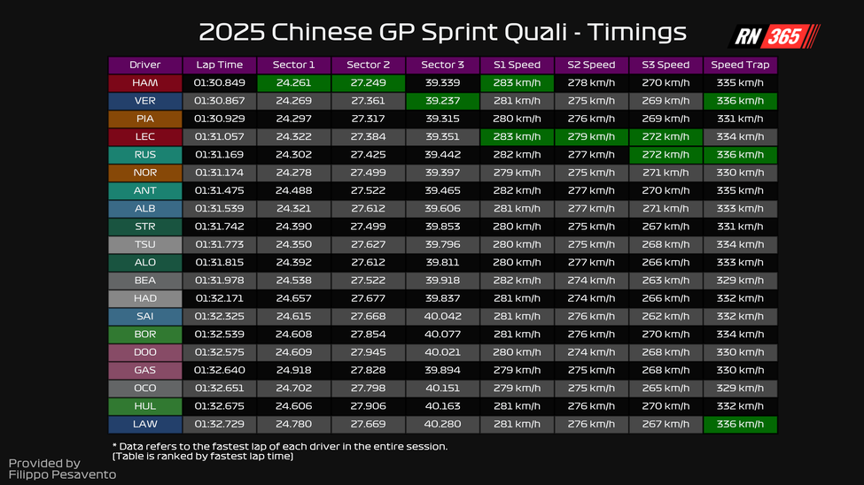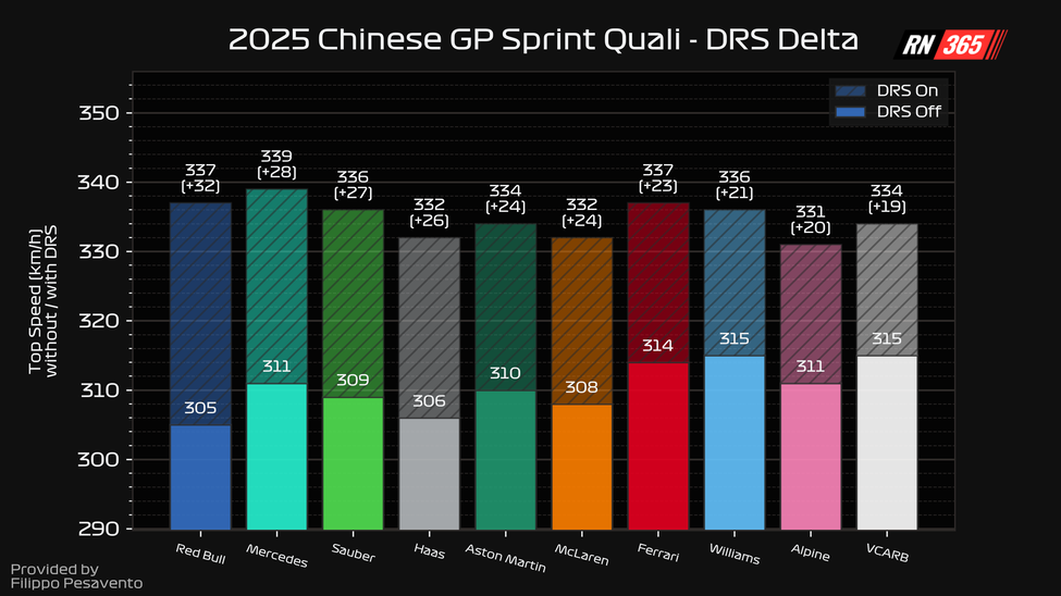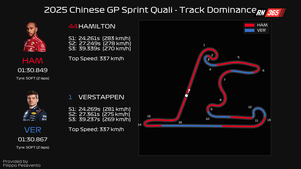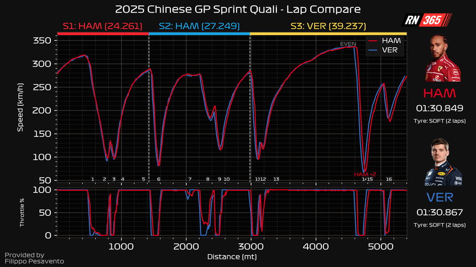 Het feit dat Verstappen ook sterk was in de exits van bochten, kan voordelig werken in de sprintrace. De achterbanden hebben het zeer zwaar te verduren in China, omdat de lange doordraaiers de temperatuur snel laten oplopen. Red Bull lijkt dat aspect goed voor elkaar te hebben, kijkend naar de data van de sprintkwalificatie. Verstappen kan snel op zijn gas, houdt de banden de gehele ronde in een goed window en pakt op die manier best wat tijd. Genoeg voor de eerste plaats was het alleen niet.