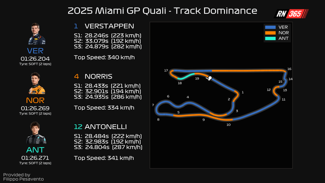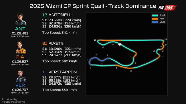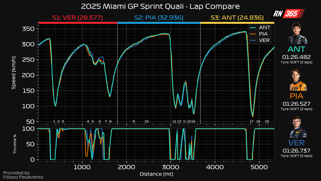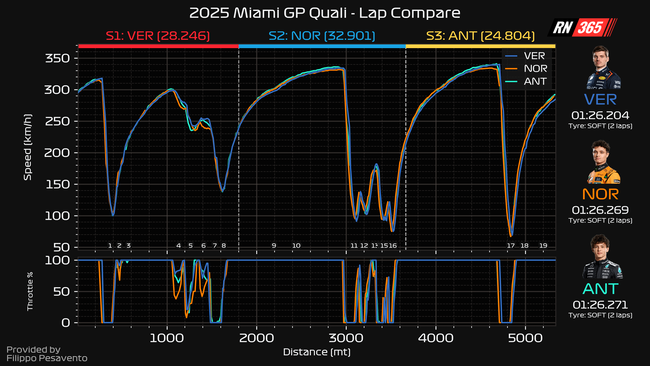 Natuurlijk, de ronde van Max Verstappen was fenomenaal en dat is altijd een factor die meegewogen moet worden in de prestatie die hij heeft neergezet. Maar bovenstaande toont ook aan dat Red Bull iets heeft gevonden wat de RB21 welwillender maakt. Iets waarmee de sterke punten van de vrijdag - bocht 4 t/m 8 zijn nog steeds zijn domein - zijn behouden, maar waarmee Verstappen tevens meer vertrouwen heeft gekregen om de bochten meer aan te vallen. Verstappen gaf zelf ook aan dat men dingen had verbeterd, zonder dat nader toe te lichten.