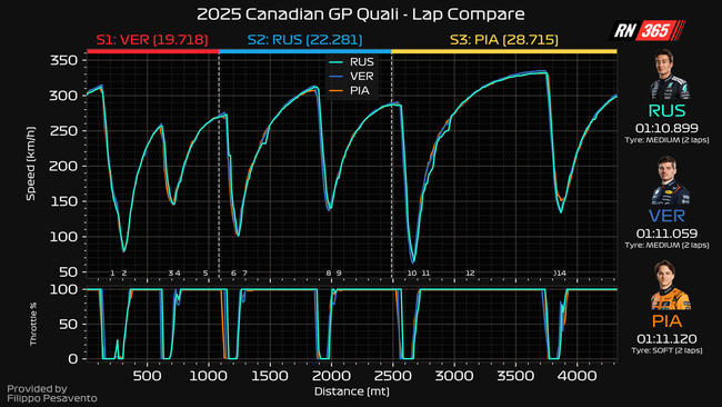 Daarvoor moeten we vooral naar de tweede sector kijken, daar waar Russell en Mercedes het hele weekend al sterk zijn. Daar wint hij ruim een tiende, waarna hij ook in sector 3 nog een tiende weet te pakken. Russell heeft in de bochtencombinaties 3 en 4, 6 en 7 én 8 en 9 de overhand en weet daar het verschil te maken.