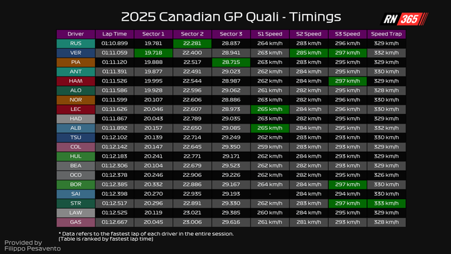 Hij weet telkens net wat later te remmen en kan in de meeste gevallen ook íets meer snelheid meenemen door de bochten. En dat is natuurlijk van belang op het snelle circuit in Canada, waar je ook op je remmen moet kunnen vertrouwen. En het voordeel van de vrijdag voor Verstappen en Red Bull, de topsnelheid dan? Verstappen staat nog steeds op de tweede positie in dat lijstje met 335 kilometer per uur, maar Russell geeft 'slechts' drie kilometer per uur toe. Het verschil is in ieder geval niet meer zo groot als op de vrijdag.