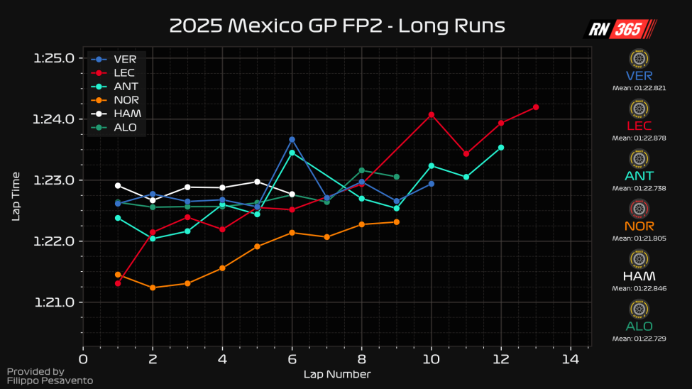 Waar zit hem dat in? Red Bull Racing heeft, net als in Hongarije, moeite om de banden in het juiste window te krijgen. De ijle, warme lucht in Mexico-Stad zorgt ervoor dat alle teams veel moeite hebben met het koelen van de motor, remmen en banden. Red Bull koos voor grote aanpassingen aan het koelprofiel van de motorkap, terwijl dat bij McLaren en Ferrari mee lijkt te vallen.