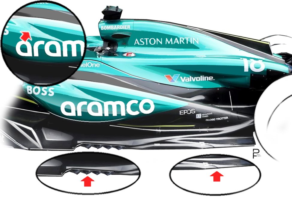De nieuwe sidepods van de AMR24 hebben een bovenprofiel dat wordt gekenmerkt door een diepe diagonale uitwaaiering, die onmiskenbaar lijkt op hetzelfde profiel dat twee jaar geleden voor het eerst te zien was bij Red Bull op de RB18 en vorig jaar ook op de uiterst succesvolle RB19.