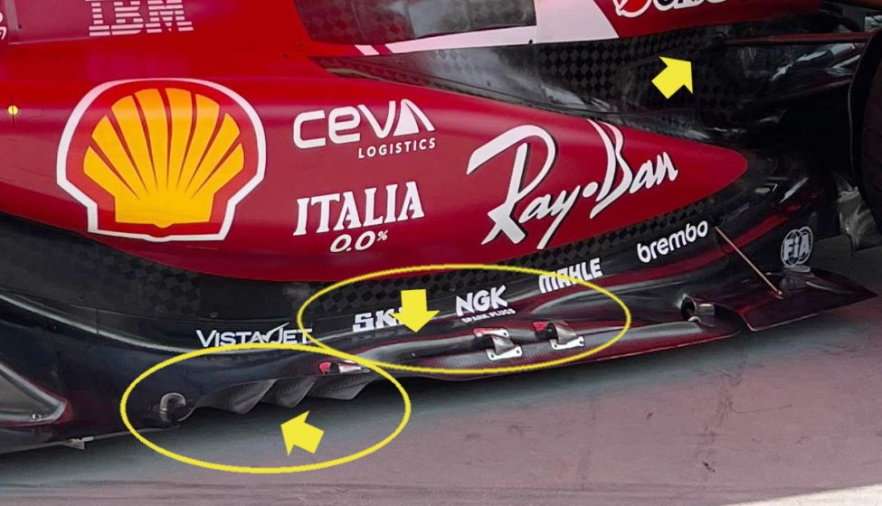 Ferrari heeft een nieuwe, aangepaste vloer naar Bahrein meegenomen. Het is een ontwikkeling die aanvankelijk deel uitmaakte van een groter pakket dat gepland was voor Miami, maar nu dus al op de auto is gezet. Het is een zeer uitgebreide aanpassing in verschillende gebieden van de vloer, te beginnen bij de voorkant waar de verticale omleiders van de luchtstroom en het profiel van de externe barges zijn aangepast. Maar het gaat ook om het expansiegebied en de volumes van de Venturi-kanalen in het centrale deel.
