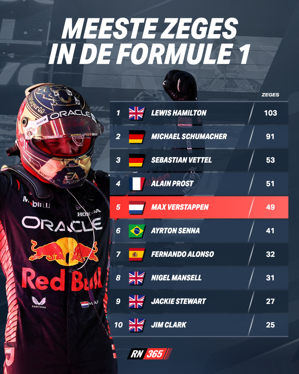 Slechts vier andere coureurs behaalden in hun carrière meer zeges dan Verstappen. Twee daarvan kan hij dit seizoen nog inhalen: Alain Prost (51) en Sebastian Vettel (53).