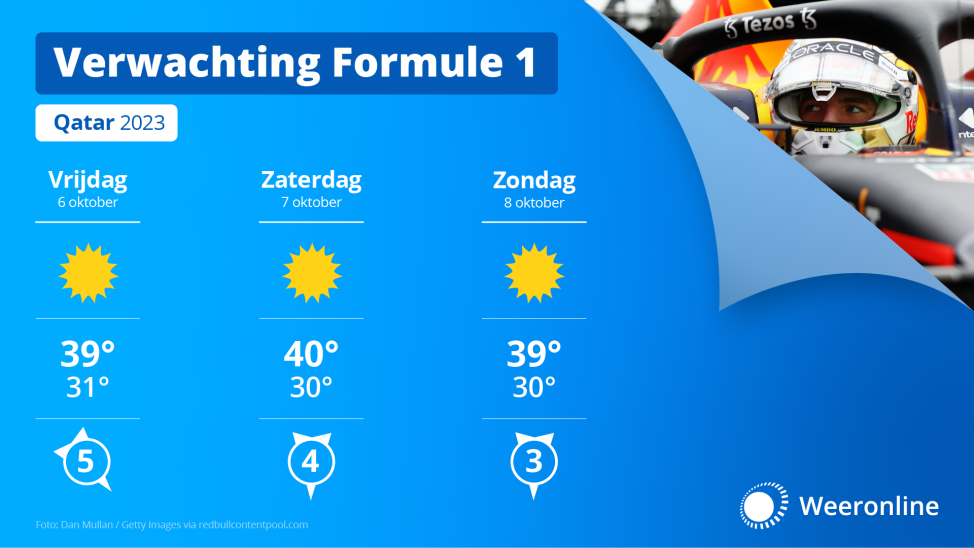 Zondag draait de wind iets meer naar het noordoosten en wordt de grens van 40 graden waarschijnlijk (net) niet meer gehaald. Alsnog staat er 38-39 graden op de thermometer, al daalt de temperatuur flink tijdens de race: in de avond wordt het zo'n 33 graden op het circuit van Losail. De wind waait op zondag met kracht 4.
