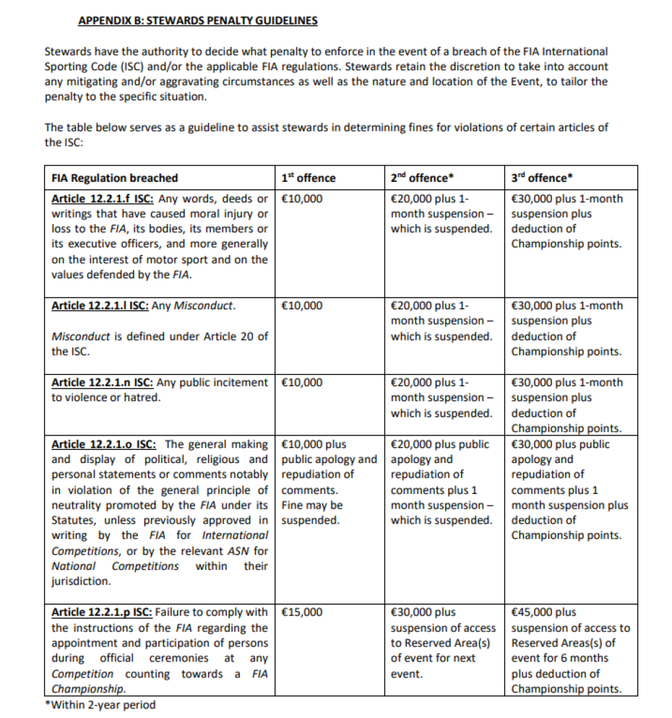 Maar de FIA heeft nu aanvullende richtlijnen gepubliceerd, waardoor de coureurs schorsingen en torenhoge boetes boven het hoofd hangen als ze wangedrag vertonen. Er worden daarbij verschillende categorieën gehanteerd, met ook verschillende straffen. De 'basisstraf' bij een eerste overtreding is 10 duizend euro, gevolgd door een boete van 20 duizend euro met een voorwaardelijke schorsing van één maand bij een tweede vergrijp. Bij een derde fout moet de coureur in kwestie 30 duizend euro betalen en wordt hij definitief voor een maand geschorst. Bovendien worden er punten afgenomen in de WK-stand.