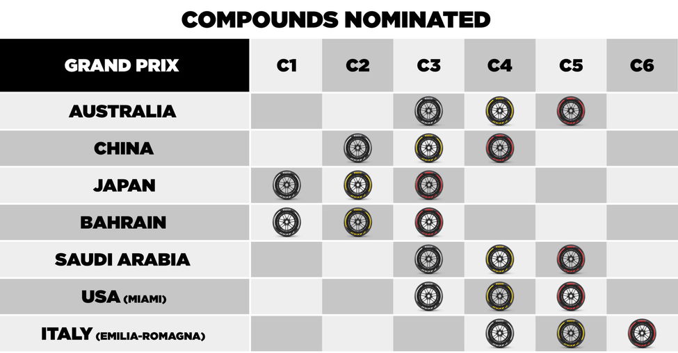 Logischerwijs is de C6-band de zachtste band op Imola, met de C5 als medium- en C4 als harde compound. Naar Miami, één race eerder, neemt Pirelli de C5, C4 en C3 mee.