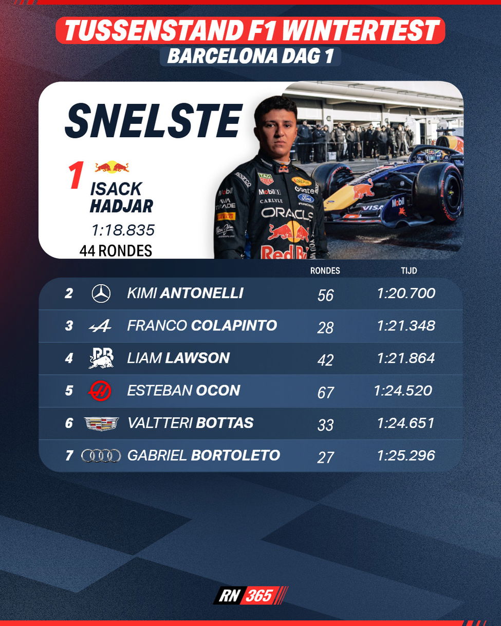 Max Verstappen zien we vandaag in ieder geval niet in actie. Hadjar neemt de gehele dag voor zijn rekening, waar Max Verstappen naar alle waarschijnlijkheid de volgende testdag voor het eerst instapt.