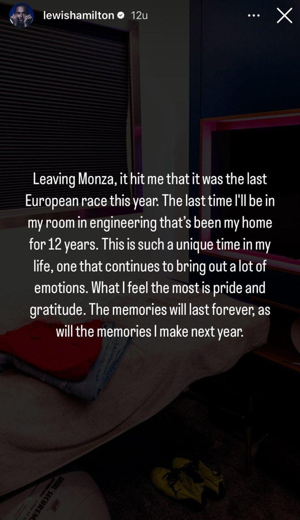 Op zijn eigen Instagram verklaart Hamilton waarom hij zo terneergeslagen was in Monza. "Toen ik Monza verliet, besefte ik dat dit de laatste Europese race van dit jaar was. De laatste keer dat ik in mijn kamer in het motorhome zal zijn, dat al 12 jaar mijn thuis is", aldus Hamilton die doelt op het feit dat de typische motorhomes van de teams niet mee gaan naar de GP's buiten Europa.