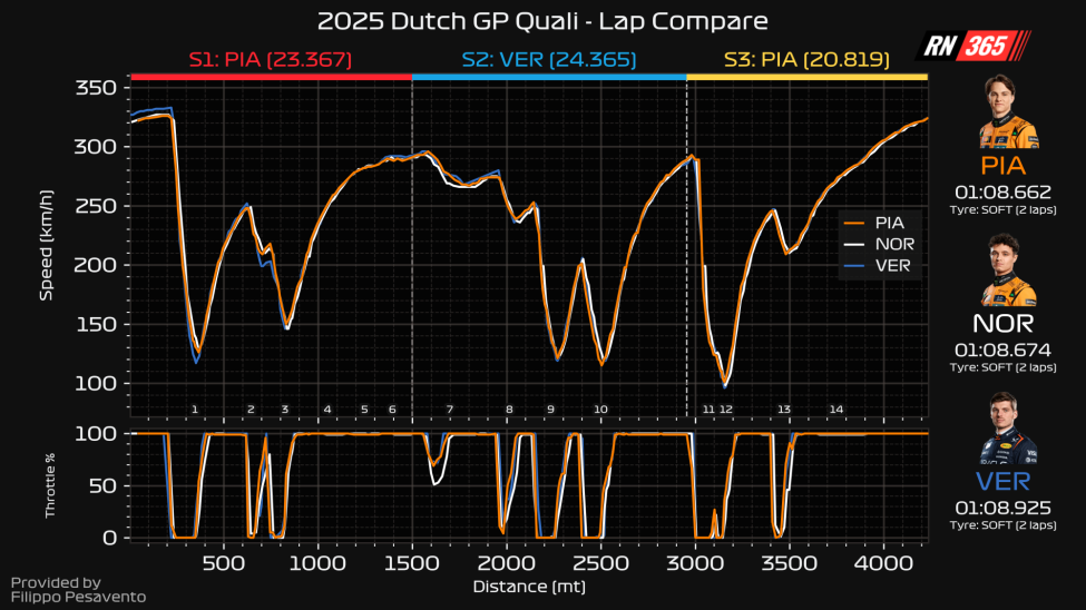 Uit de data blijkt dat Red Bull de auto daadwerkelijk heeft verbeterd richting de kwalificatie én dat Verstappen opnieuw het verschil maakt. In de tot nu toe pittige tweede sector was Verstappen verrassend sneller dan de McLarens, al bood dat geen soelaas om polesitter Oscar Piastri en Lando Norris het vuur aan de schenen te leggen. Verstappen geeft vooral in bocht één, twee en drie veel tijd toe, omdat hij er met aanzienlijk minder snelheid doorheen gaat. Het verschil gaat richting de tien kilometer per uur.