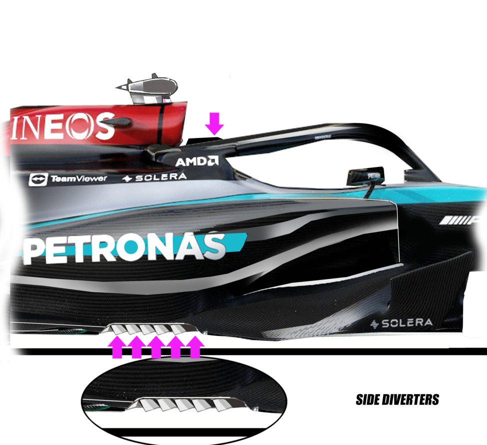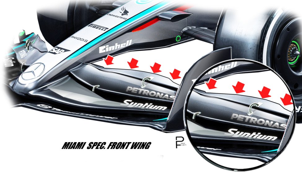 Een aparte vermelding gaat naar Mercedes, want het team uit Brackley lijkt op een eindeloos verval af te stevenen. In Miami presenteerde het team een derde versie van de voorvleugel met een licht gewijzigde neuskegel in het voorste gedeelte. Verder was de vloer ook grondig gewijzigd, met een andere vorm van de laatste flap. Tot slot was de verticale doorsnede van de zijsleuven versterkt en was het aantal luchtgeleiders vergroot. De twee substantiële veranderingen leverden geen betere prestaties op.