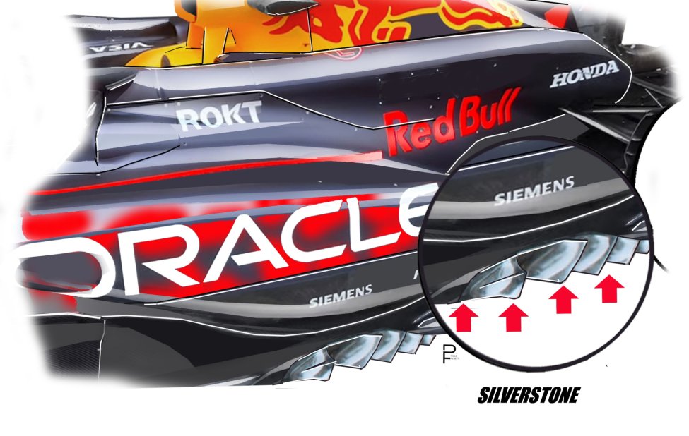 Op de afbeelding zie je de aangepaste vloer in Silverstone. Het was een duidelijke indicatie dat de auto niet gevoelig was voor ontwikkeling, waardoor het dynamische gedrag van de RB20 ongewijzigd bleef. De tekst gaat verder na de afbeelding.