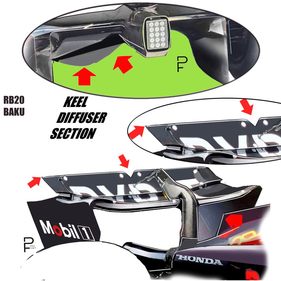 Op onderstaande afbeelding is de vernieuwde diffuser te zien die werd geïntroduceerd in Bakoe. Het was de eerste stap in het herstel van de prestaties van de RB20, waarmee de stabiliteit van de achterkant werd verbeterd.