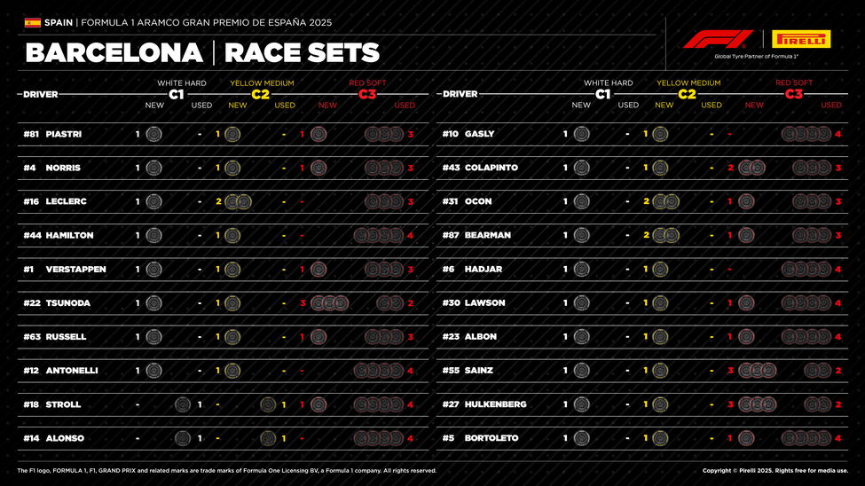 Kijken we naar de overgebleven bandensets in het overzicht hieronder (swipe), dan zien we namelijk dat Max Verstappen van álle compounds nog een hagelnieuw setje banden over heeft. Hetzelfde geldt echter ook voor de beide McLaren-coureurs, dus het valt niet uit te sluiten dat ze op dezelfde strategie zitten.