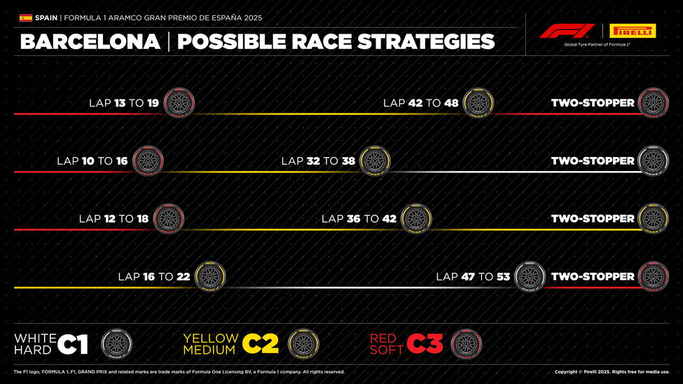 Pirelli gaat in alles volledig uit van een tweestopper, zo laat onderstaande visual zien. Daarbinnen is een grote diversiteit aan combinaties mogelijk, waarbij volgens de Italiaanse bandenfabrikant zacht-medium-zacht niet alleen de meest aanvallende strategie zou zijn, maar ook de snelste.