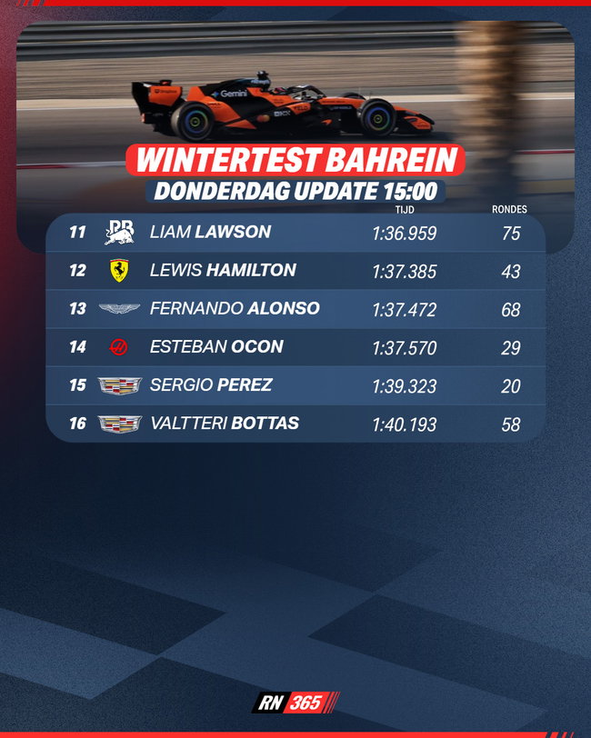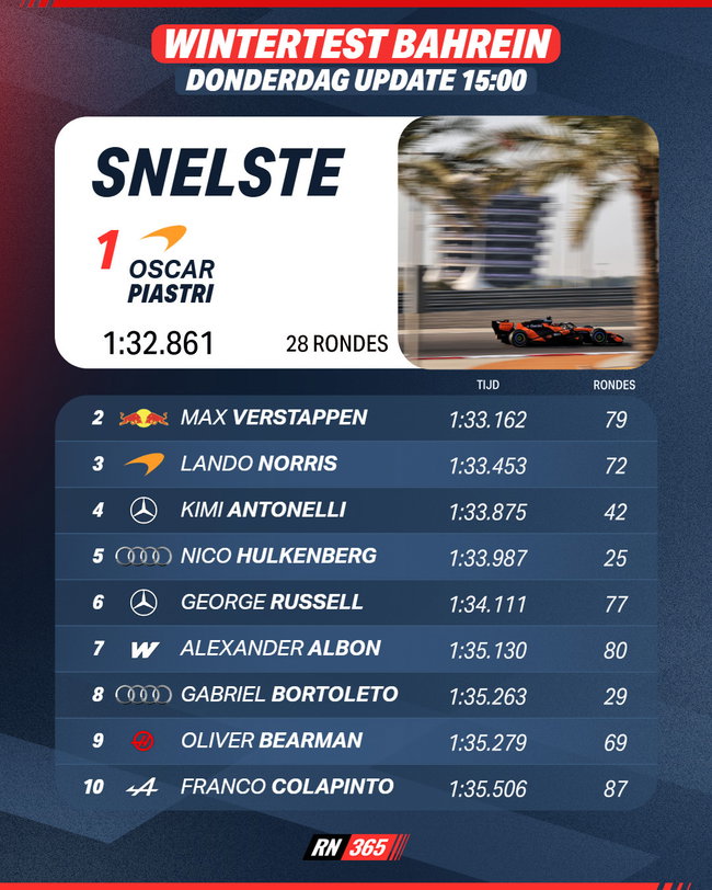 Een positieve vermelding is er ook voor Audi, dat stukje bij beetje meer snelheid lijkt te vinden. Nico Hülkenberg ging er eens even goed voor zitten en dook de 1:33 in. Dat is voorlopig goed voor een vijfde plaats in de pikorde. Kimi Antonelli reed de vierde tijd in zijn Mercedes.
