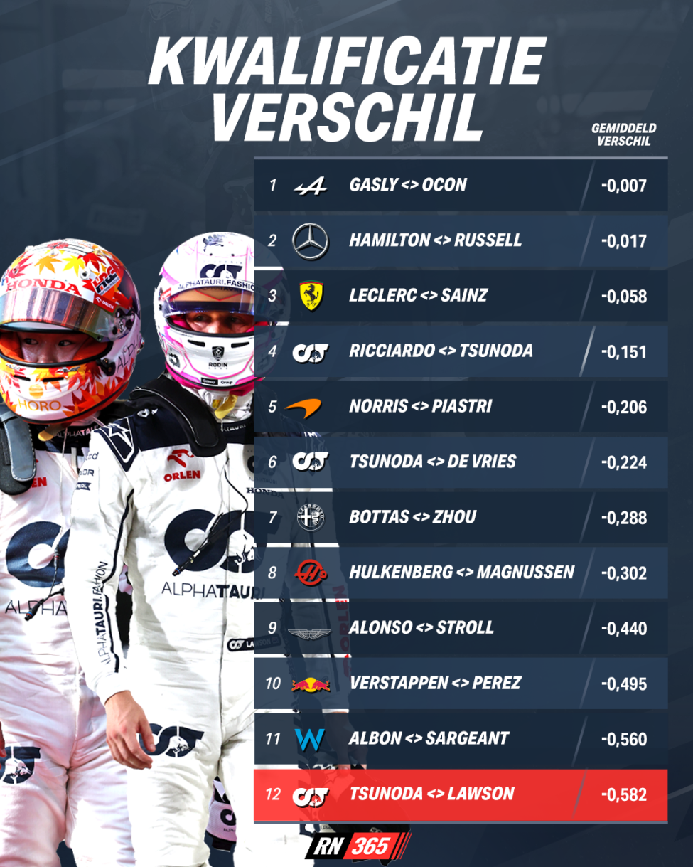Het grootste verschil op het gebied van rondetijd was er bij AlphaTauri, waar de inmiddels ervaren Yuki Tsunda het opnam tegen rookie Liam Lawson. In de vijf races die Lawson meedeed was hij gemiddeld 0,582 seconden langzamer dan de Japanner. Ook Logan Sargeant was gemiddeld meer dan een halve seconde langzamer dan teamgenoot Alexander Albon met een achterstand van 0,560 seconden. Sargeant wist overigens geen enkele keer(!) voor Albon te starten.