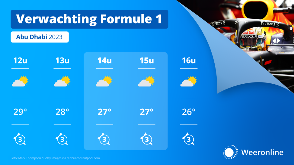 Ondanks dat de laatste race op de Formule 1-kalender in november plaatsvindt, hoeven de fans absoluut geen winterjas aan op het Yas Marina Circuit. Naar verwachting wordt het namelijk zondag tijdens de Grand Prix van Abu Dhabi zo'n 27 graden.