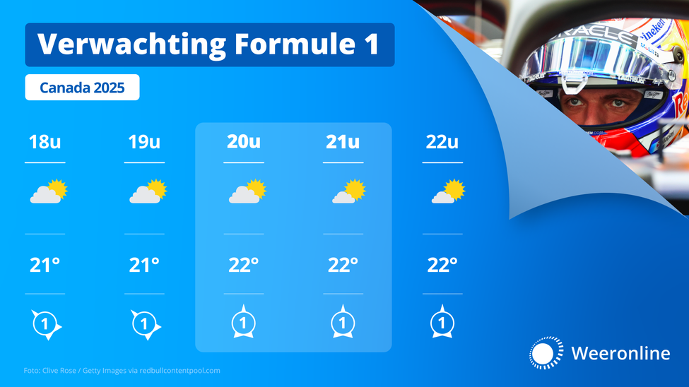 De race op het Circuit Gilles Villeneuve start om 20:00 uur Nederlandse tijd, terwijl het op dat moment 14:00 uur is in Montreal. De grote vraag is: wat doet het weer? Er zijn zonnige perioden met wat dunne sluierwolken en wat kleine stapelwolkjes. Daarbij wordt het ongeveer 22 graden.
