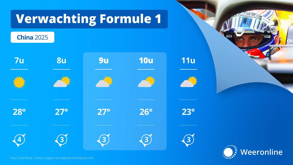 Vanuit het westen naderen buien het Shanghai International Circuit, maar het duurt nog een tijd voordat die er ook daadwerkelijk zijn. De race is dan al verreden, dus Max Verstappen kan zijn talent in de regen dit keer zeer waarschijnlijk niet inzetten.