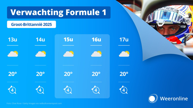 Aan het begin van de week werd het in Silverstone nog ruim 31 graden en in de volle zon was het asfalt met gemak 15 graden warmer. De temperatuur daalde daarna naar 22 tot 25 graden en tijdens de race wordt het 20 graden. Voor de tijd van het jaar is dit een hele gebruikelijke waarde. Vandaag kunnen vooral in de ochtend nog buien voorkomen. Deze trekken daarna weg en het ziet ernaar uit dat het tijdens de race droog blijft.