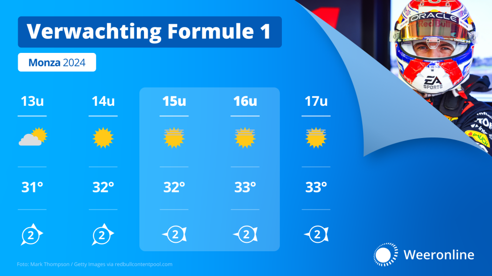In Nederland is het deze zondag aardig warm, maar ook in Italië krijgen de coureurs te maken met een temperatuur die veel hoger ligt dan gebruikelijk is. Op 1 september is het namelijk gemiddeld 26 graden in Monza, met een uitschieter naar 30 graden. Maar tijdens de race zal het 33 graden worden en bovendien wordt de race precies op het warmste moment van de dag verreden, waarbij er ook nog eens weinig wind staat.