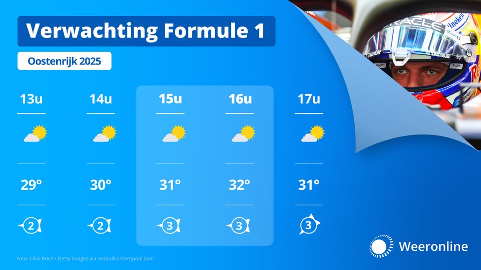 In grote delen van Europa stijgen de temperaturen dit weekend tot tropische waarden en Oostenrijk is daarop geen uitzondering. Tijdens de Grand Prix, die om 15:00 uur van start gaat, is het namelijk 31 of 32 graden op de Red Bull Ring. Ondanks dat er af en toe wat stapelwolken langs drijven, schijnt de zon ook geregeld. Het asfalt zal daardoor flink opwarmen en het wordt dus een hete race voor de coureurs.