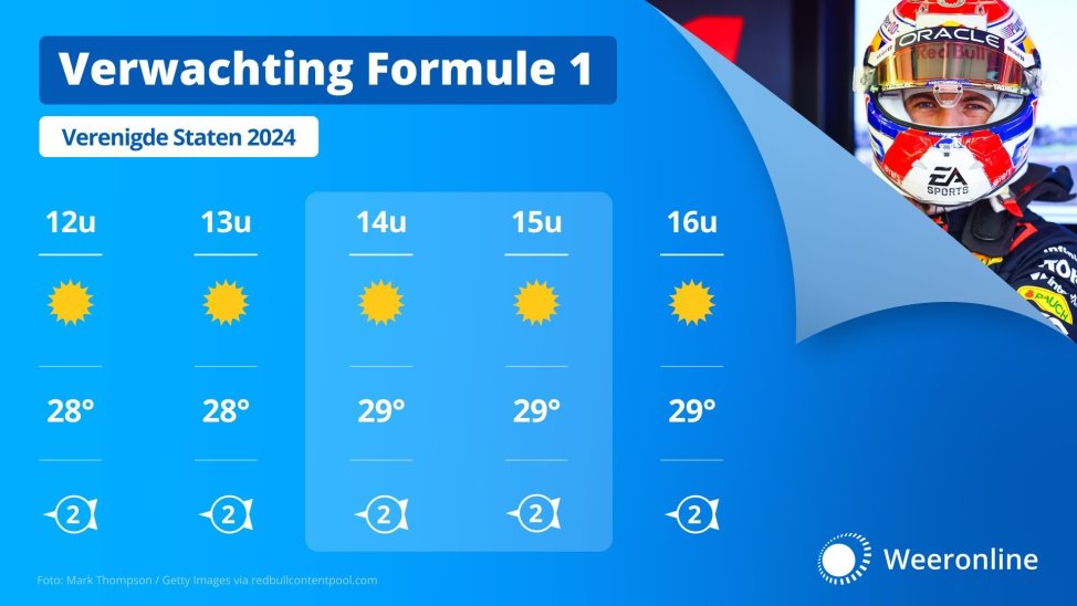 De race op het Circuit of the Americas in Austin, Texas start om 14:00 uur lokale tijd. In de zuidelijk gelegen Amerikaanse stad kan het in oktober nog opvallend warm zijn en dat zien we op deze zondag ook goed terug. In de ochtend komt de temperatuur namelijk al ruim boven de 20 graden uit, waarna de temperatuur in de middag snel naar zomerse waarden stijgt.