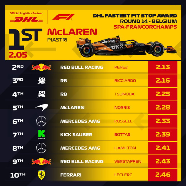 Dit seizoen wisten tot op heden Red Bull, Ferrari en Visa Cash App RB een overwinning er uit te slepen, maar daar is na de race in België een nieuwe naam aan toe te voegen. McLaren liet namelijk Red Bull achter zich en behaalde zo haar eerste overwinning in de pitstraat van het seizoen. Het team uit Woking wist nét niet onder de 2 seconden te duiken met Oscar Piastri: 2.05 seconden. Het was wel voldoende om Red Bull de hielen te laten zien. Het team van Max Verstappen en Sergio Perez vinden we terug op de tweede plaats. De pitstop van Perez ging in 2.13 seconden.