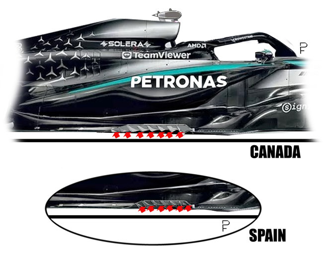 Mercedes heeft ook met vortexgeneratoren de efficiëntie van de vloer verhoogd. In dit geval had de wijziging rechtstreeks betrekking op de zijrand van de vloer van de W16, ter hoogte van de aanzet van de podcast. Daar is het aantal miniprofielen verhoogd om wervelingen te genereren die de luchtstroom naar buiten leiden. De onderkant van de auto is in dat opzicht kritiek. De W16 van Mercedes liet het hele weekend een goede balans zien, vooral omdat de auto goed over de kerbstones reed. Dat was cruciaal om een competitieve rondetijd neer te zetten.