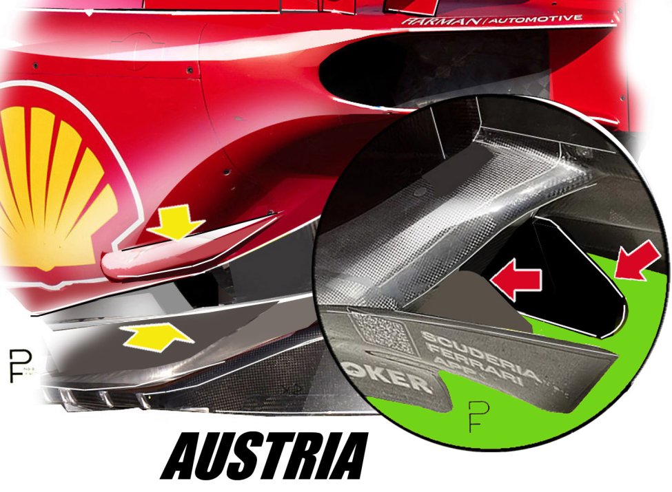 In Oostenrijk probeerden de engineers, onder leiding van Tondi, om de breedte van het kanaal tussen de sidepods en de vloer te vergroten, wat botste met de onoverkomelijke grens die werd gevormd door de bescherming tegen zijdelings impacts (zie de details op de afbeelding).