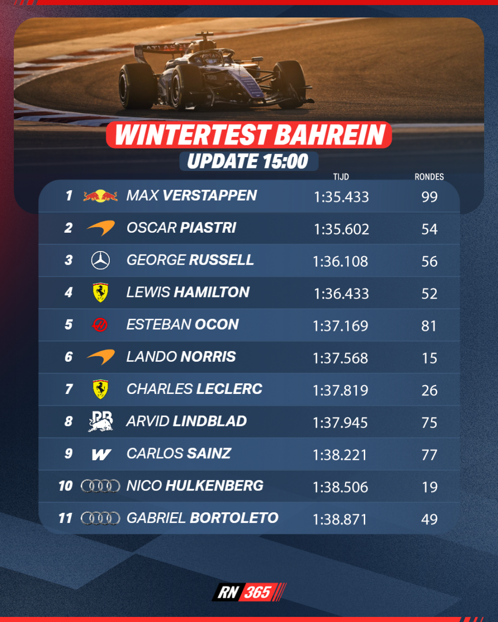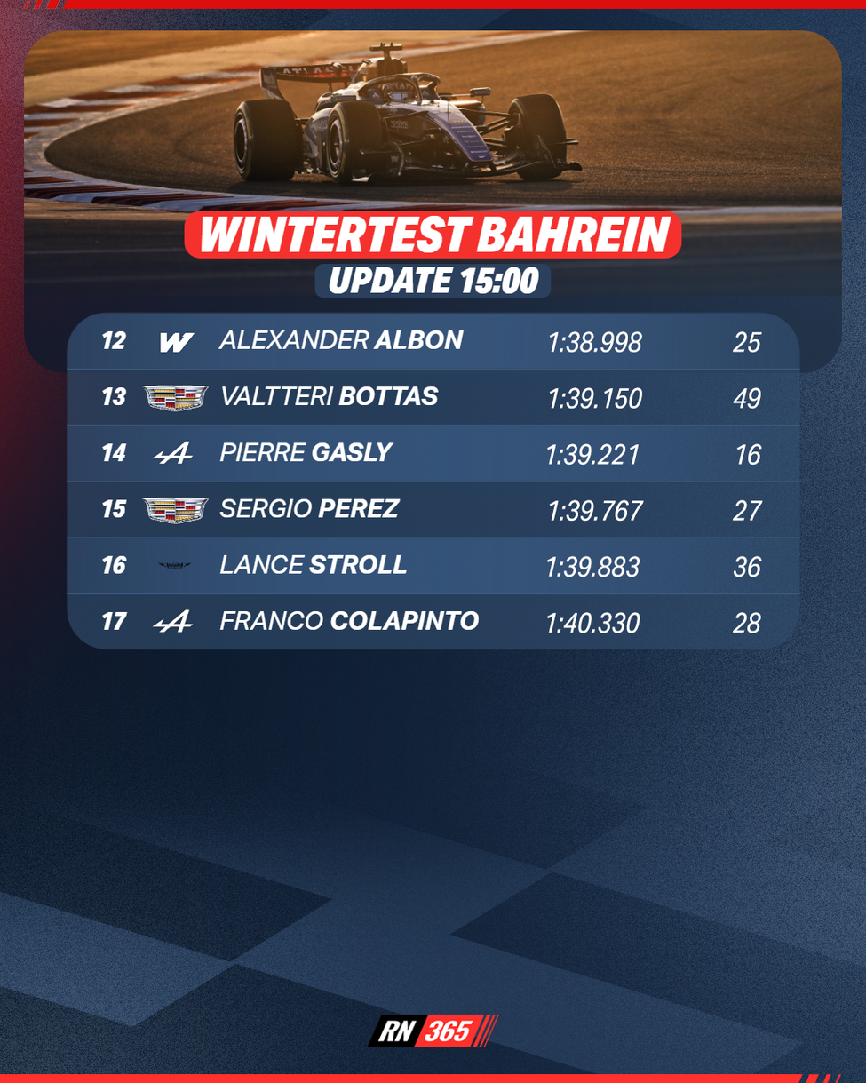 En wat laat Cadillac ondertussen zien, de enige échte nieuwkomer op de grid? Valtteri Bottas reed in de morgen 49 ronden, terwijl Sergio Perez daar in de middag 27 ronden aan toevoegde. Op bijna vier seconden achter de kop draait het daar vooral om leren, leren en nog eens leren.