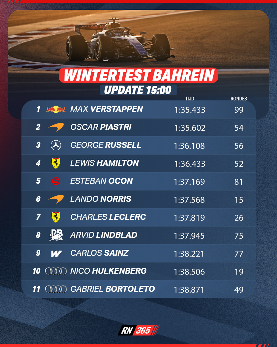 Kijk, dat Max Verstappen nu met 99 ronden met afstand de meest productieve coureur van de dag is in Bahrein, laat zich makkelijk verklaren door het feit dat Red Bull als één van de weinige teams vandaag maar één coureur inzet. Lekker voor het vertrouwen in de betrouwbaarheid van chassis en motor is het natuurlijk wel.