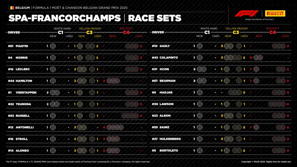 Lewis Hamilton en Kimi Antonelli mogen met deze strategische opties dan weer wel van geluk spreken, want zij hebben respectievelijk nog drie en vier sets zachte banden over, bovenop twee sets mediums én een setje hards. Mocht het dus droog blijven, hebben zij iets meer strategische vrijheid. Mogelijk kan hen dat nog helpen om een weg naar voren te vinden, aangezien ze beiden vanuit de pitstraat moeten starten.