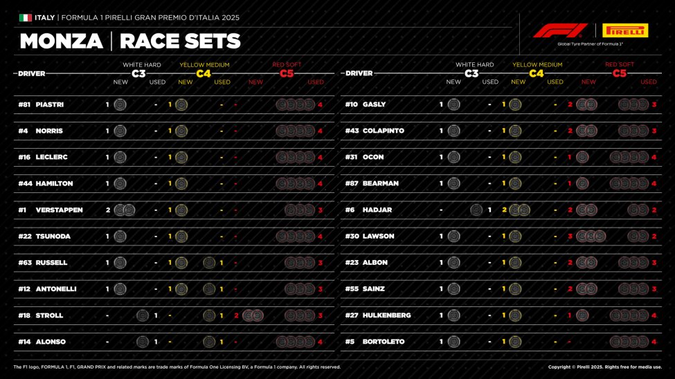 Bekijk hieronder welke de bandensets de coureurs nog over hebben voor de race in Monza.