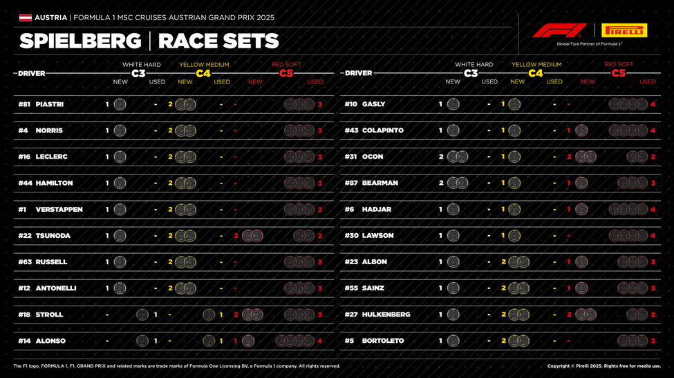 Zoals wel vaker dit seizoen komt Pirelli met verschillende strategische opties voor de teams voor de desbetreffende Grand Prix, maar alle vier de tactieken in Oostenrijk hebben één ding gemeen: ze beginnen op de medium. Vanaf daar scheiden de wegen zich, waarbij drie van de mogelijke strategieën in een tweestopper eindigen en één in een eenstopper.