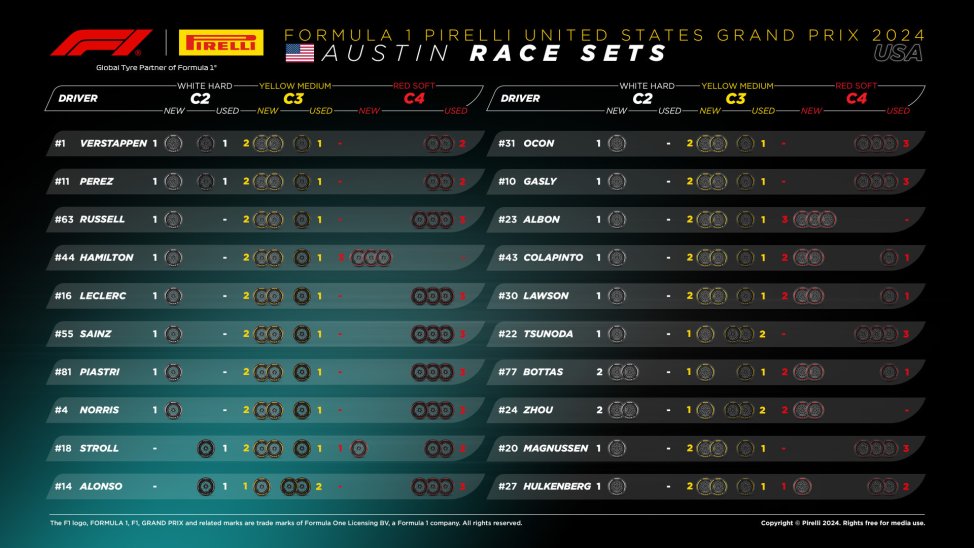 Grootste vraag is dan natuurlijk: welke sets banden hebben de coureurs nog over? Het antwoord is voor de topteams in ieder geval simpel, want zij beschikken allemaal nog over dezelfde sets nieuwe banden, namelijk één nieuwe set hard en twee nieuwe sets mediums. Ze hebben echter geen nieuwe sets zachte banden meer over.