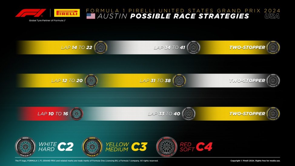 Om die reden voorspelt de bandenfabrikant dat een tweestopper de ideale strategische keuze zal zijn. Daarbij hebben de teams nog wel keuze tussen de diverse banden, want volgens Pirelli zijn er ditmaal drie strategiëen die de teams het beste kunnen kiezen. Daarbij lijkt voor de meeste topteams de tweestopper met twee keer medium en één stint hard de beste keuze. Starten op de mediums lijkt dan wel vast te staan, maar bij de eerste pitstop kun je dan kiezen of je wederom een stint op mediums doet of al kiest voor de switch naar de harde band.