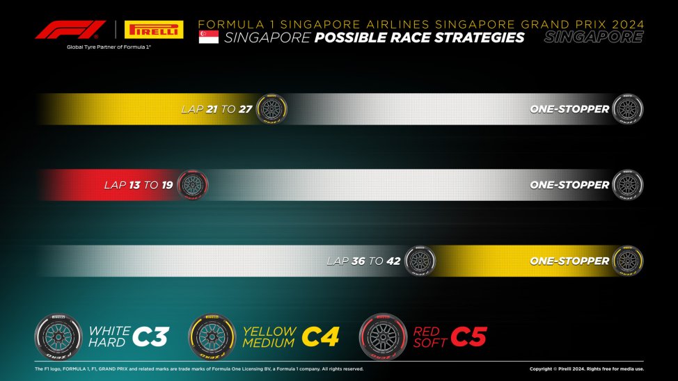 De ideale strategieën van Pirelli spreken aardig voor zich. Voor de coureurs die op de medium-banden van start gaan, zal de ideale pit window tussen ronde 21 en 27 liggen. Met nog ongeveer veertig ronden te gaan is wisselen naar de harde band dan de enige optie, al kunnen de teams het volgens Pirelli ook omdraaien door op de harde band te starten. De coureurs die daarvoor kiezen zouden tussen ronde 36 en 42 naar binnen moeten voor een setje medium-banden.