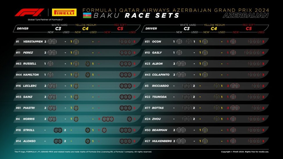 Wat de coureurs van de topteams betreft lijkt Norris de enige te zijn die nog beschikt over een andere optie. Hij heeft, na zijn teleurstellende kwalificatie, nog drie nieuwe setjes zachte banden over bovenop die twee setjes harde banden en dat setje mediums. Het Baku City Circuit is als stratencircuit natuurlijk anders dan bijvoorbeeld het circuit in Monza, waar we twee weken geleden ook op een eenstopper mikten. Toch kan het nog een voordeel zijn om een setje zachte banden ter beschikking te hebben, mocht de bandenslijtage niet te extreem zijn en er nog een gaatje zijn om zachte banden te gebruiken.